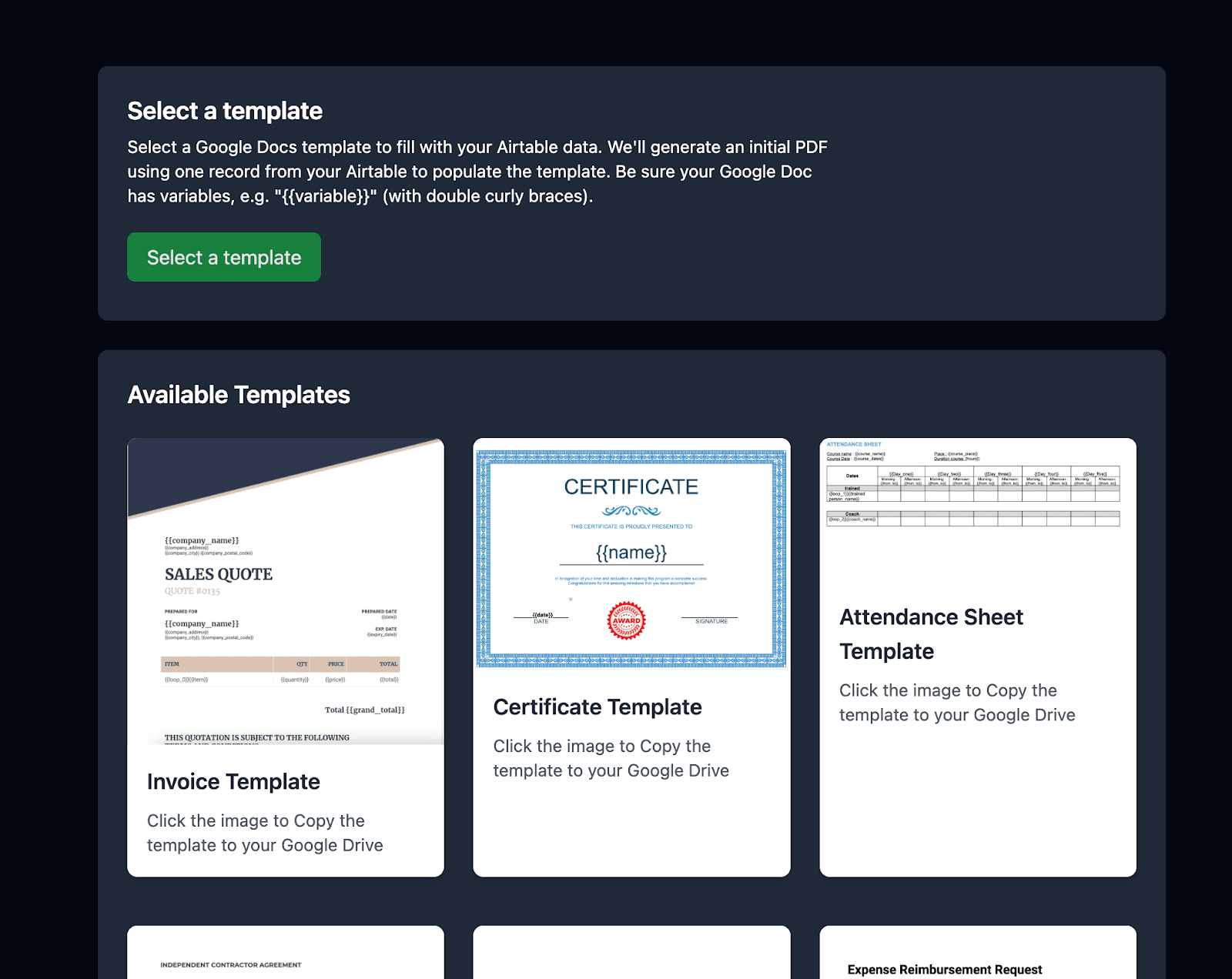 A template is a pre-designed file with placeholder variables that your Airtable data replaces. Design your layout once in Google Docs-add your logo, choose fonts-then insert placeholders that tell the system where to insert dynamic content from each record.