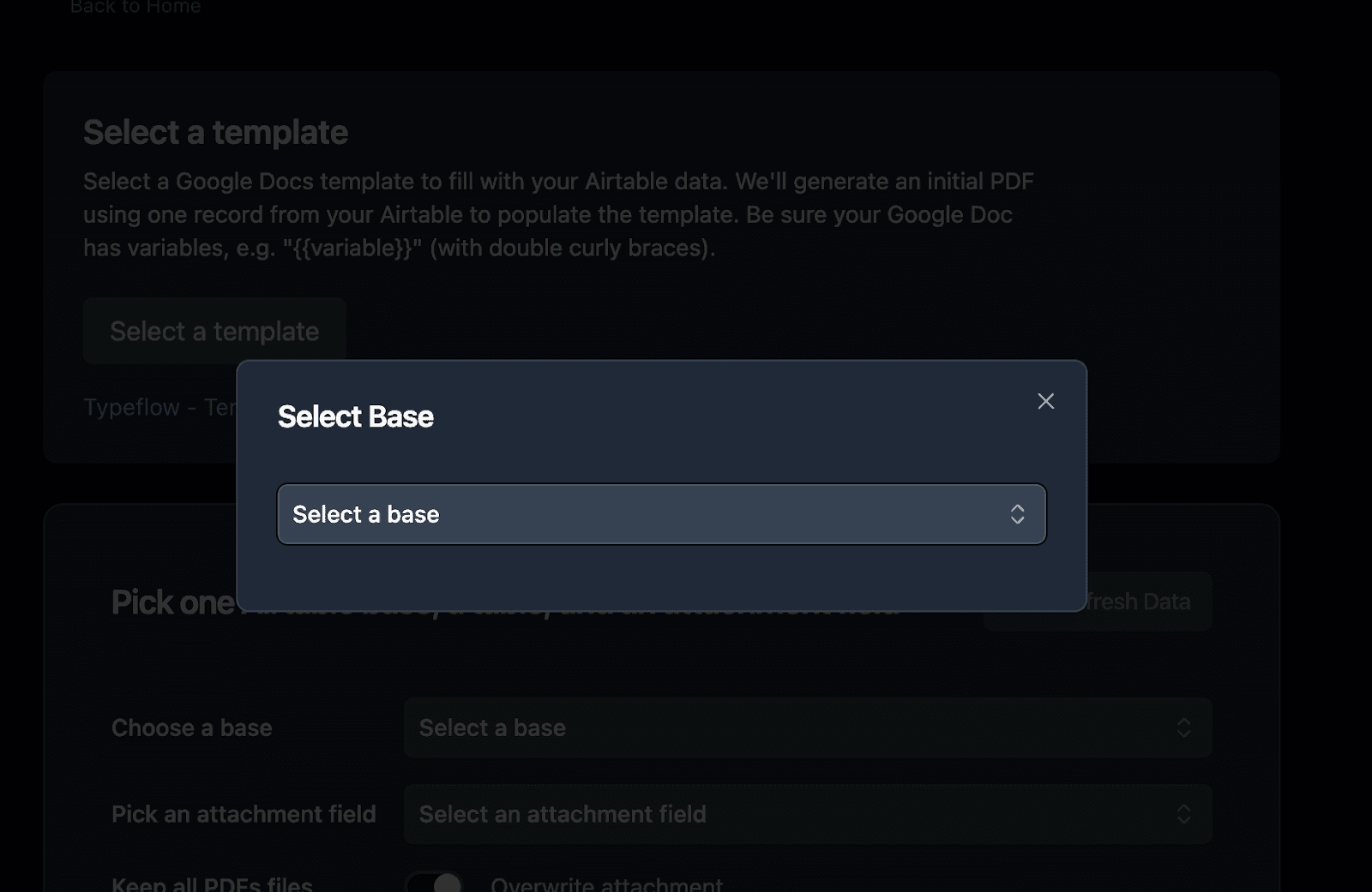 This connection allows TypeFlow to read data from your bases when generating documents. You can select only the bases you want to work with.