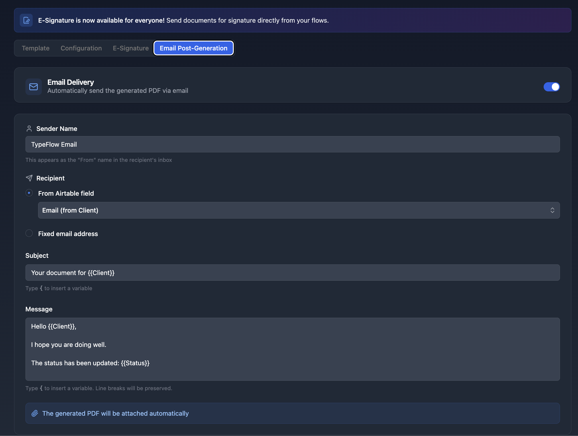 {{variables}}that map directly to your Airtable fields - Bulk generation: Select all investor records and generate personalized PDFs in a single action