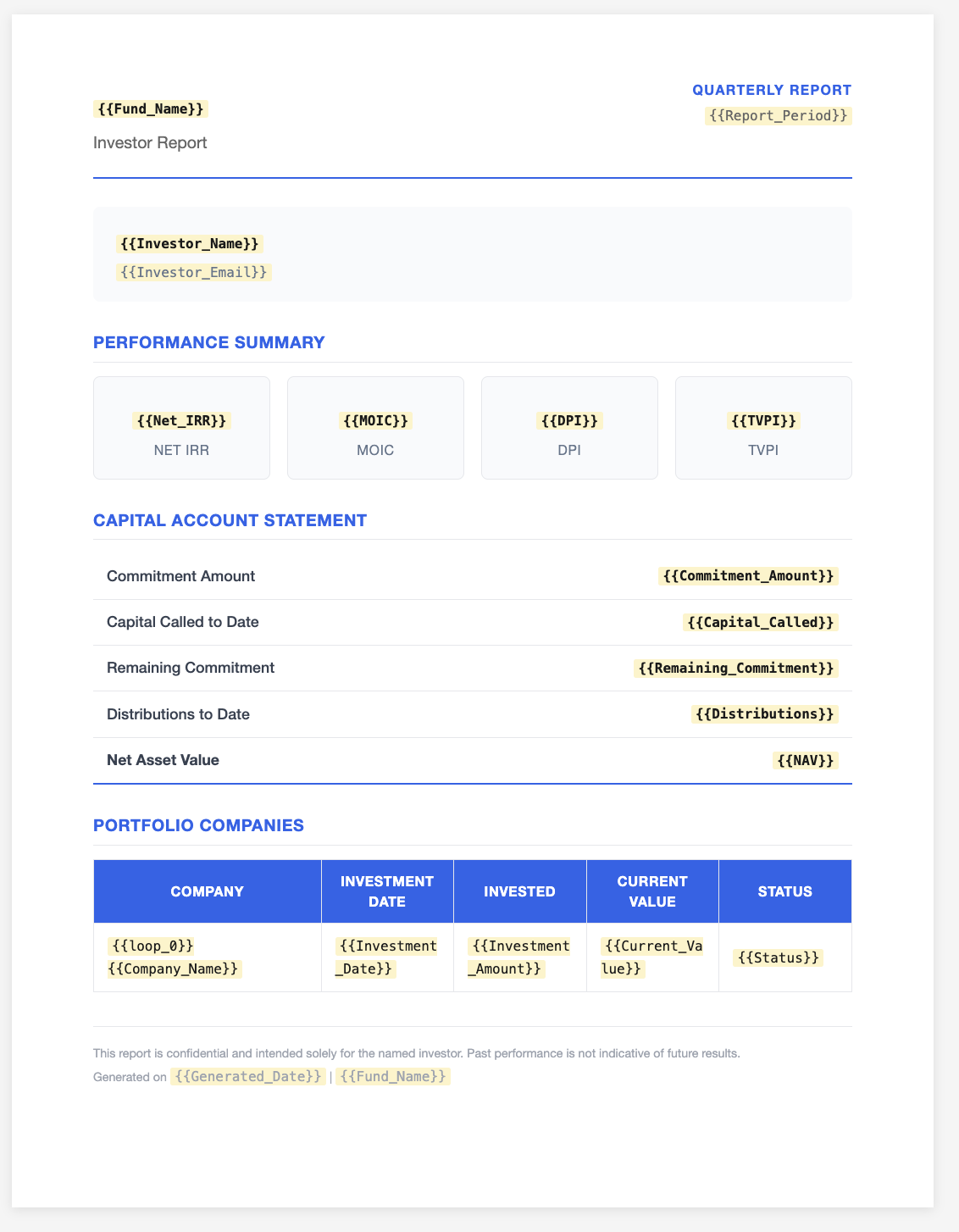 If you manage investor relations in Airtable, you're probably spending hours every quarter copying commitment amounts, distribution data, and portfolio updates into Word documents. With private equity and venture capital firms managing over $13 trillion in assets, professional investor reporting isn't optional - it's expected.