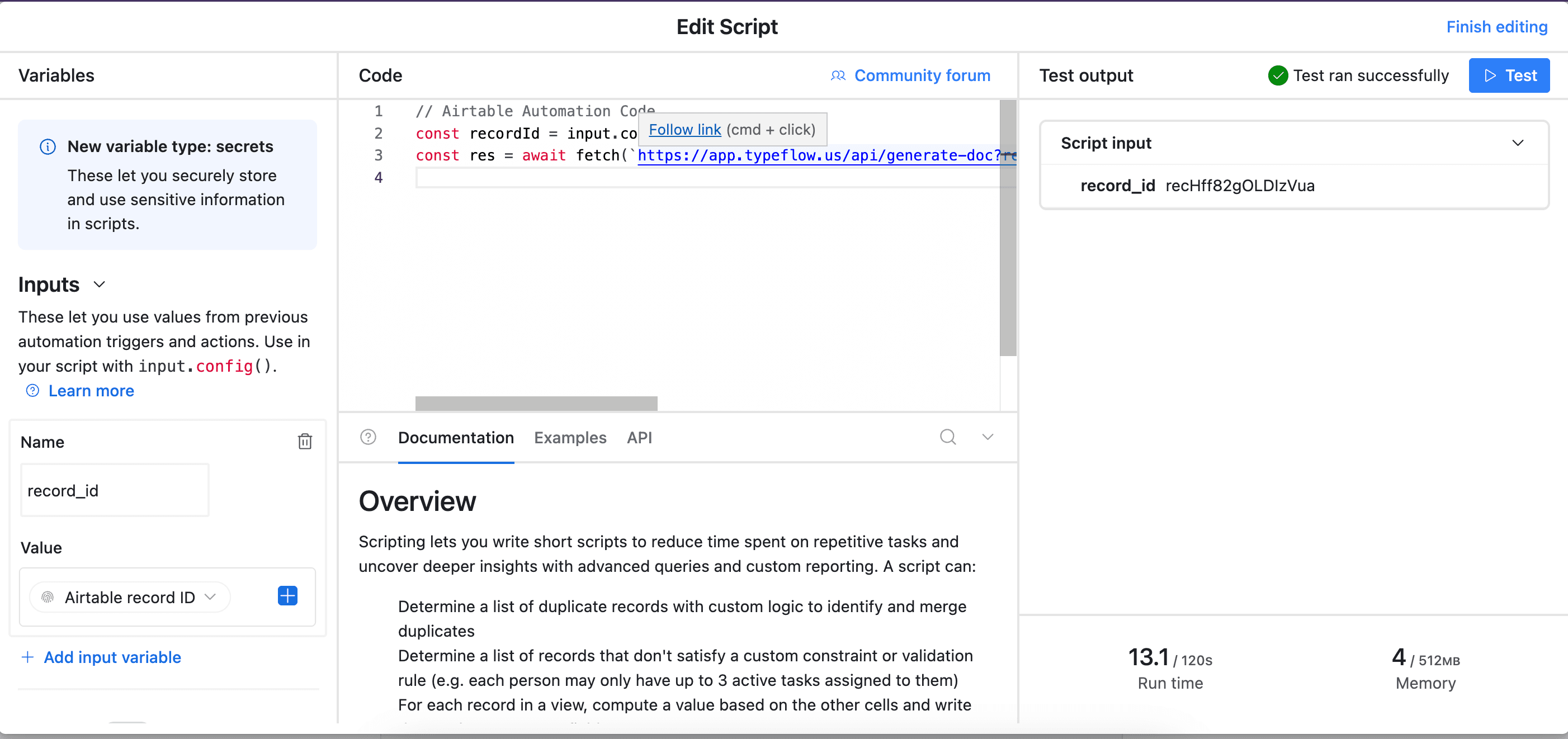 Go back to TypeFlow and select Automation in Airtable. Copy the script.