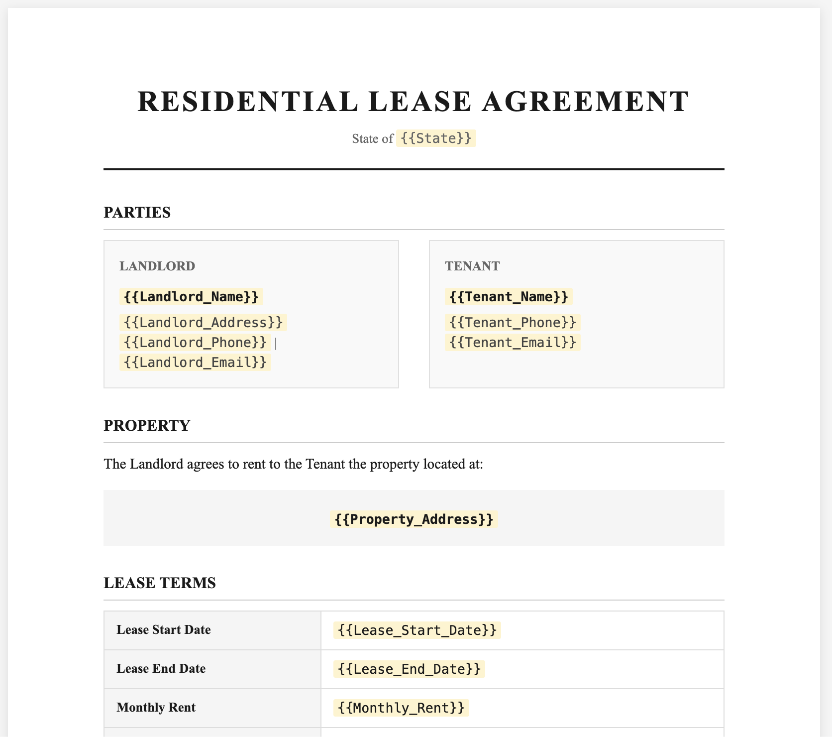 If you already have a lease agreement in Word or Google Docs, you can convert it into a template by adding placeholder variables.